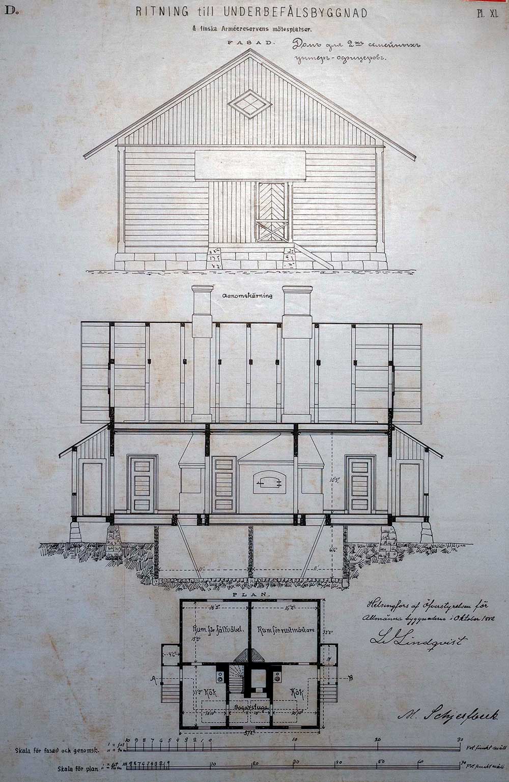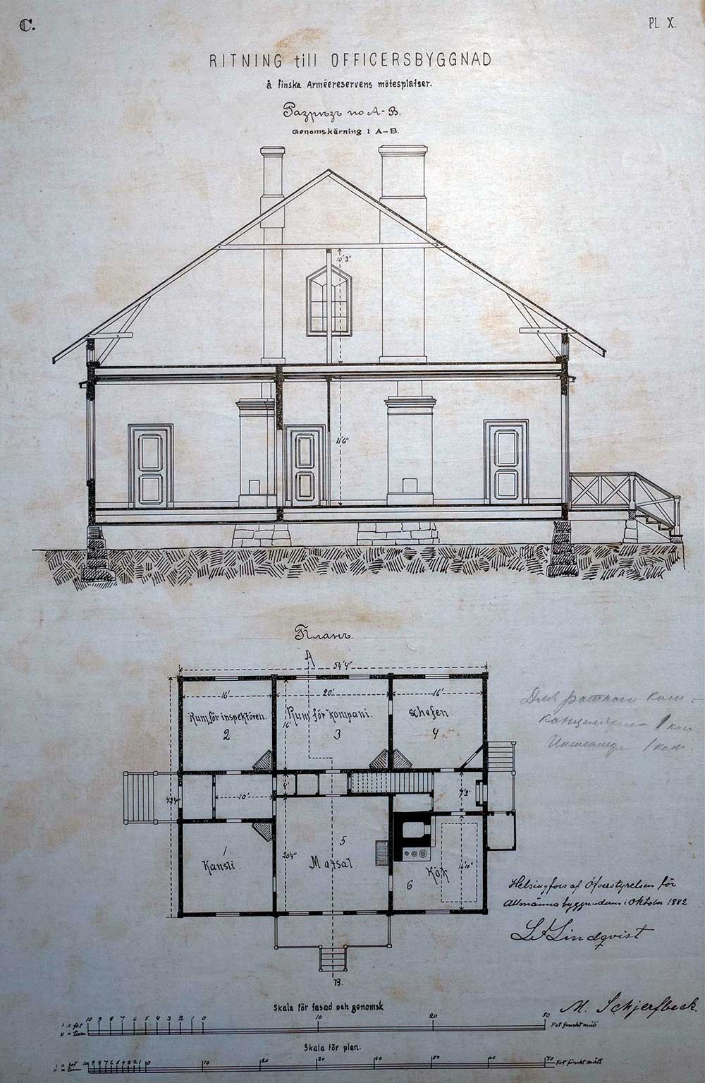 3) Upseerirakennus, jossa oli komppanian päällikön asunto ja kanslia sekä huone komppaniaa tarkastamaan saapuvia upseereita varten. Viimeksi mainittu huone oli alkuvaiheessa alakerrassa, mutta noin 1892 yläkertaan tehtiin kaksi huonetta, päällikön huoneet, tarkastajia varten. Hirsirakenteisen rakennuksen pituus oli 16,3 ja leveys 12,7 m.