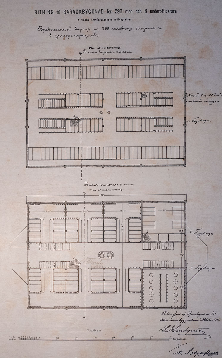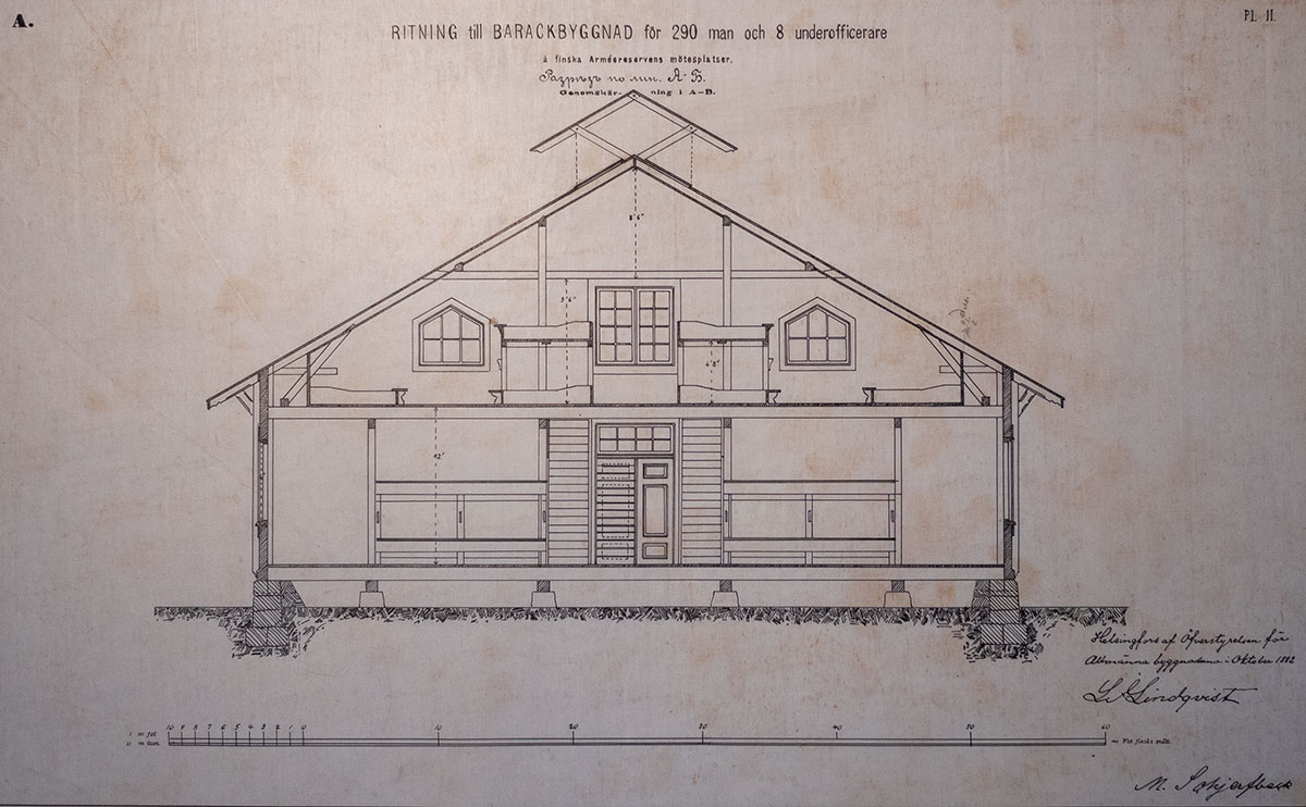 1) Miehistörakennus (Manskapsbarack). 290 miestä ja 8 aliupseeria varten. Hirrestä hakatun 2-kerroksisen rakennuksen pituus oli 24,9 ja leveys 16,6 m. Rakennukseen oli sisäänkäynti molemmista päistä. Alkuperäisen rakennuspiirustuksen mukaan alimmaisen kerroksen käytävältä noustiin yläkertaan neljää porraskäytävää pitkin. Myöhemmin nämä portaat korvattiin rakennuksen päätyyn sijoitetuilla ulkoportailla.